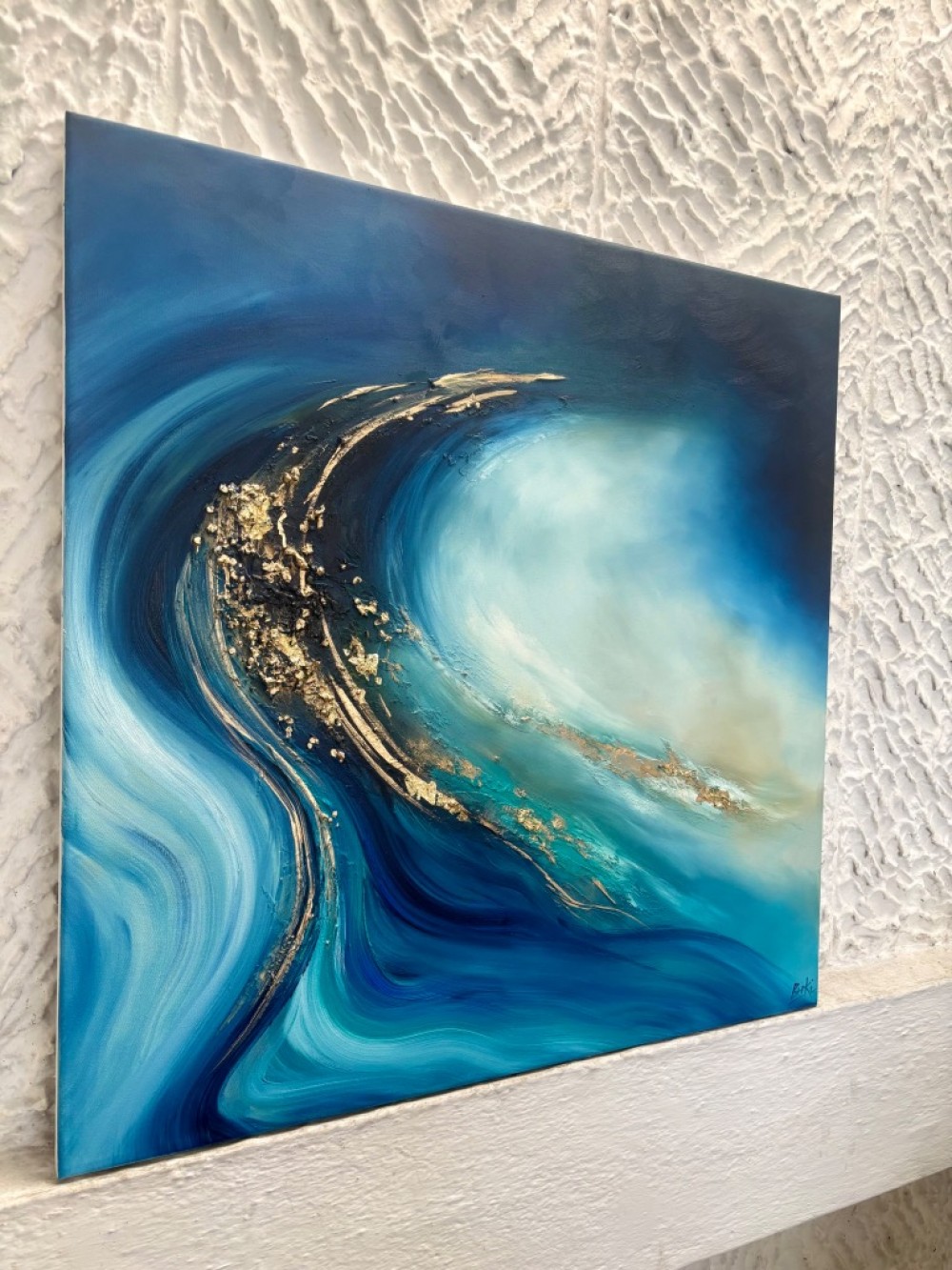 In this piece, I swirled oil and plaster to capture the dynamic essence of movement. The spiraling blues and turbulent strokes express a deep emotional release, like an unstoppable wave freeing itself. Accents of golden leaf infuse the composition with bursts of light and energy, symbolizing hope and resurgence. This artwork brings a powerful and uplifting energy to any space, inviting viewers to dive into their own depths and emerge renewed.